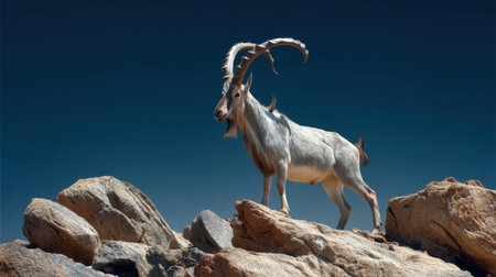 A stunning image of a wild goat showcasing its magnificent horns, standing proudly on rocky terrain beneath a vibrant blue sky, embodying the beauty of nature.