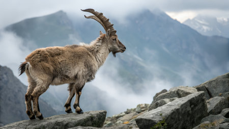Amidst the rugged beauty of the mountains, a markhor stands confidently on rocky terrain, its impressive horns contrasting against the misty backdrop of distant peaks and clouds.