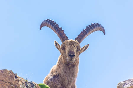 wild mountain brown goat with big horns stands at rock and looks in camera. male pride leader
