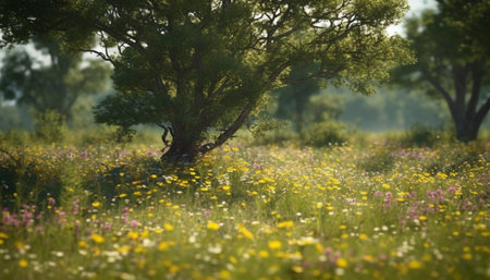 Tranquil meadow blossoms with wildflowers in the summer sunlight generated by artificial intelligence