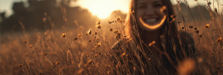A stunning young woman captures a serene moment, her wavy hair illuminated by golden hour sunlight, exuding beauty and calm in a peaceful outdoor setting.