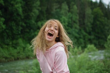 Funny portrait of amazing emotional young girl in pink casual clothes with long hair looking at the camera and grimacing on the hill with green forest background during spring in the mountains.