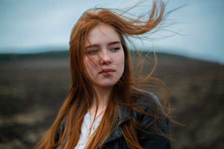 Red-haired girl in the mountains