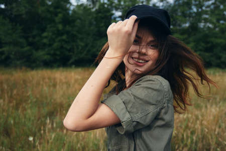 woman straightens her cap on her head and green shirt nature fresh air