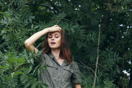 Woman in the forest With his mouth open, he keeps his hand on his head summer