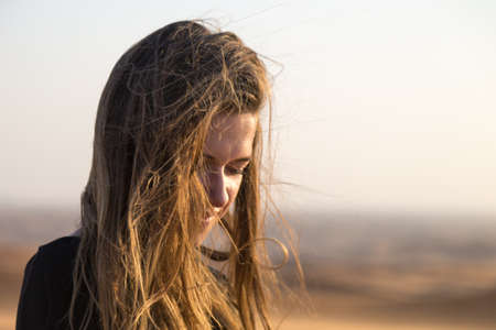 Caucasian young woman with long hair in a black dress at sunrise in the desert.
