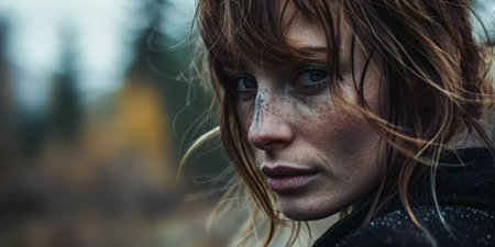 Close up portrait of young woman with short dark hair and freckles, showcasing her expressive eyes and soft lips. lighting creates dramatic effect, enhancing her features