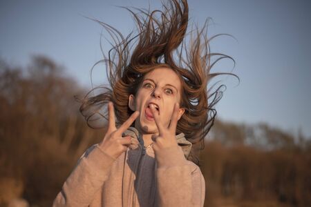 happy young girl with blowing hairs
