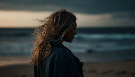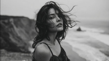 On a windy beach, a woman stands with her hair blowing in the wind. She gazes thoughtfully into the distance, surrounded by cliffs and a moody sky, evoking a sense of solitude.