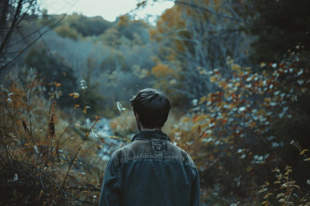 A person with short hair gazes into the distance while standing in a dense forest filled with fog. The twilight creates a serene yet eerie ambiance with towering trees.
