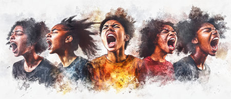 A group of young black individuals passionately demonstrating in a harmonized effort, radiating energy and determination to amplify their message amidst a gray backdrop.
