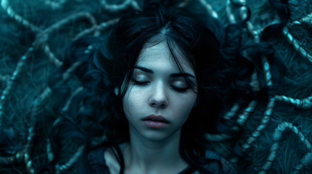 A woman with dark eyes and long black hair laying on a bed of rope, AI