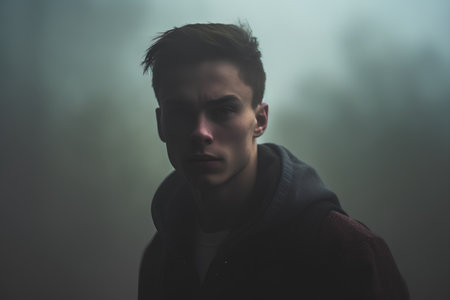 Portrait of a young man in a dark forest with fog.