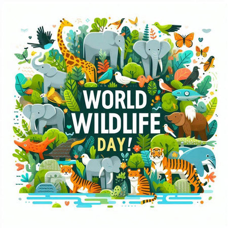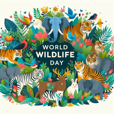 World Wildlife Day greeting card with wild animals and flowers. Vector illustration.