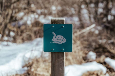 A closeup shot of a blue sign of a white snake attached to a wood
