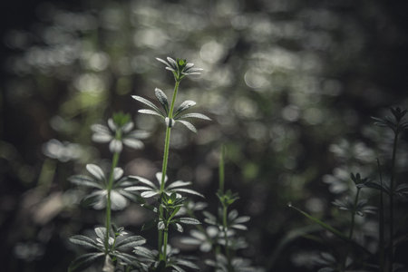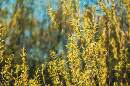 The scene presents abstract textures of nature featuring soft-focus elements with bokeh and green plants during the spring season.