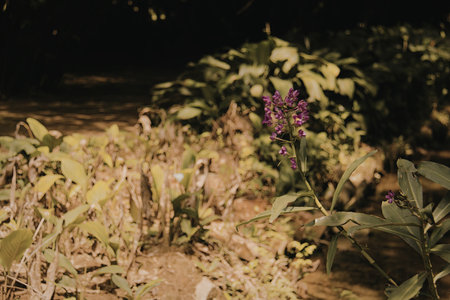 Purple oregano plant growing in the forest, selective focus
