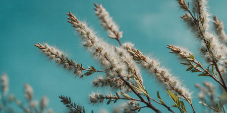 AI Generated. Blooming fluffy willow branches in spring close-up on nature macro with soft focus on turquoise blue background sky Vintage muted tones, copy space, ultra-wide format
