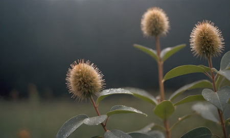 Gentle wildflowers stand tall amidst a soothing haze of pale blue and teal. The tranquil environment captures the serene essence of dawn, inviting quiet contemplation.