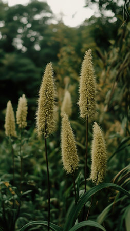 Group of slender plants with yellowish fluffy spikes thriving in a vibrant garden setting