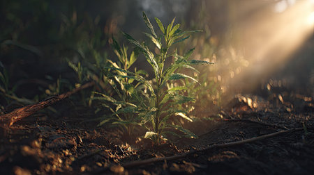 Young green plant sprouting from soil with warm sunlight creating hopeful and fresh atmosphere in nature