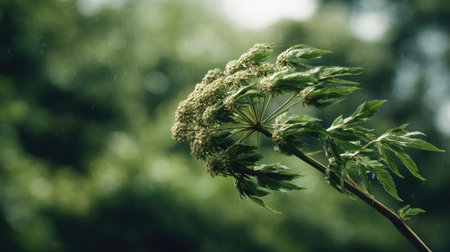 A detailed photograph of a single Angelica, swaying gently in the wind, captured in natural daylight. Fresh and airy atmosphere, soft motion blur on leaves, crisp details on textures, background softly blurred into natural greenery, cinematic natural light, realistic photography style.