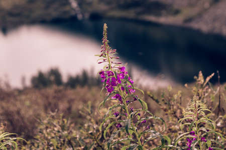 flowering herbs in the forest above the river blurred background