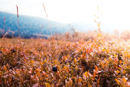 Alpine flora covered with frost in at autumn in the mountains