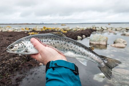 Wild salmonid fish Salvelinus often called charr or char with pink spots over darker body. Close-up view of freshwater fish snout on rocky shore. Summer fishing with spinning and fishing rod.