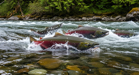 Salmon leap onto rocky riverbeds and swim upstream with rapids. Alaskan Salmon Migration: A Journey Full of Challenges and Wonders. USA., 2017