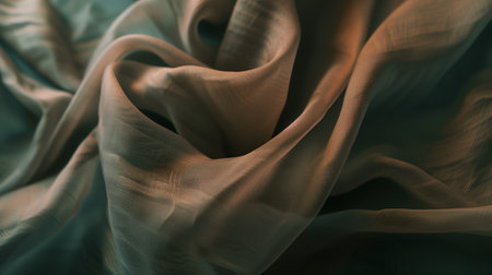 Ethereal sheer fabric in soft brown tones gracefully flows and curves, catching the light.