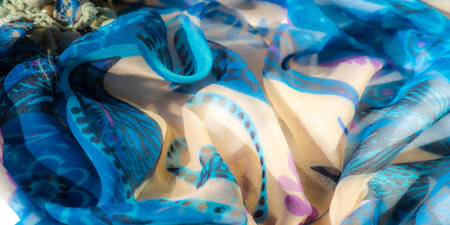 Blue fabric. Silk fabric in fine organza with panther print, Crumpled texture. Background. Template.
