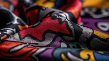 This close-up image showcases a colorful textile with an abstract design. The fabric displays a mix of red, black, yellow, and purple hues with dynamic patterns. Its textures are emphasized through lighting and composition. The photograph could be used for various commercial projects related to design and fashion.