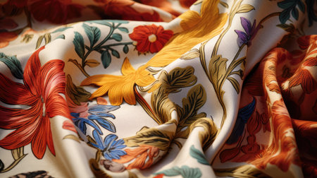 A close-up view of a beautifully patterned fabric featuring warm hues. The delicate material gracefully folds and swirls, showing intricate designs and textures.