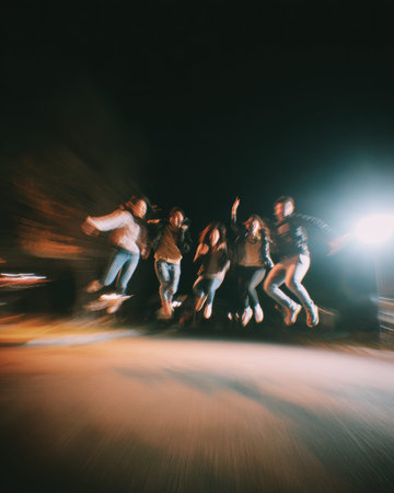 Abstract blur atmosphere: happy people enjoying outdoor music festival concert, raised up hands and clapping of pleasure, active night life concept, play of light and shadow on the huge stage