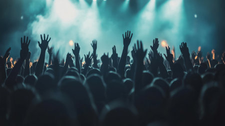 Excited Crowd with Raised Hands Enjoying a Memorable Live Music Performance Under Bright Stage Lights