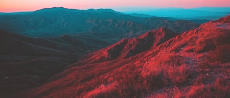 A stunning view of rolling hills and misty mountains under a blue sky at dawn. The vibrant pink and orange hues create a peaceful and serene atmosphere, perfect for nature lovers.
