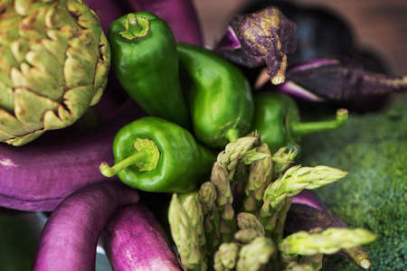 Nice vegetable still life of thin purple eggplants, green paprika peppers, plumps, artichoke, brocoli and asparagus. Raw food life style.
