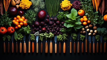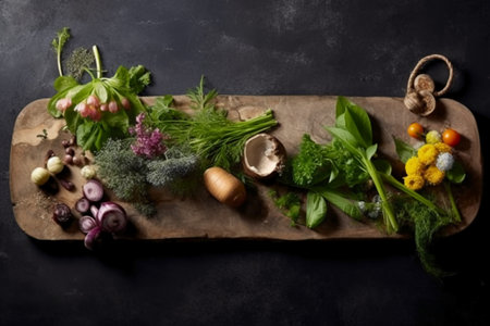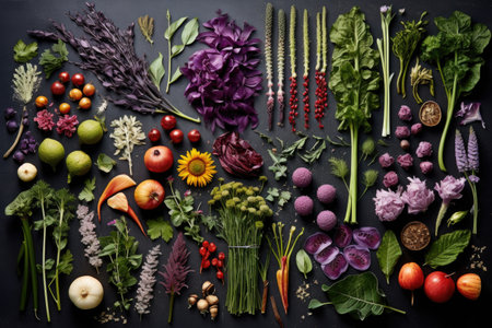 various edible plants arranged in a flat lay, created with generative ai