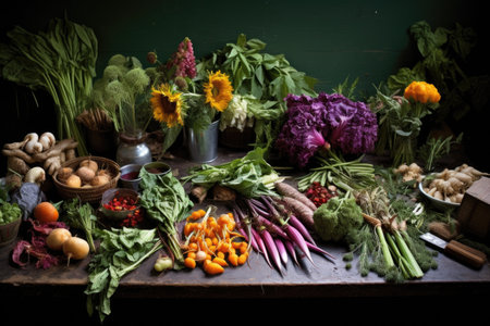 The table is adorned with a variety of plants and flowers including vegetables and flowering plants. The assortment includes fruits, petals, and grass, creating a beautiful natural food landscape