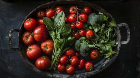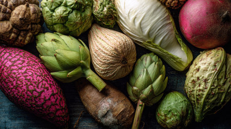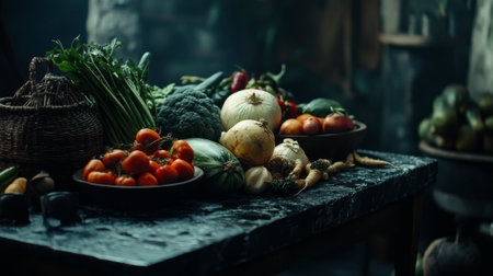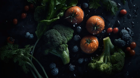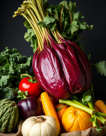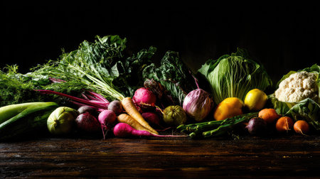 Explore a visually enticing collection of fresh organic vegetables artistically arranged against a dark background, showcasing natural beauty and vibrant colors.