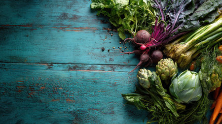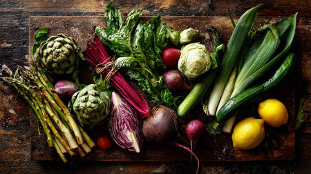 A stunning arrangement of fresh organic vegetables on a rustic wooden table, highlighting vibrant colors and textures ideal for culinary inspiration and healthy living.