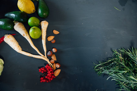 Vegetables and fruits for cooking on a gray dark background