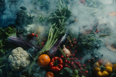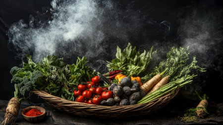 A vibrant assortment of fresh herbs and vegetables in a rustic basket, shrouded in smoke, showcasing natural colors and textures perfect for culinary inspiration.