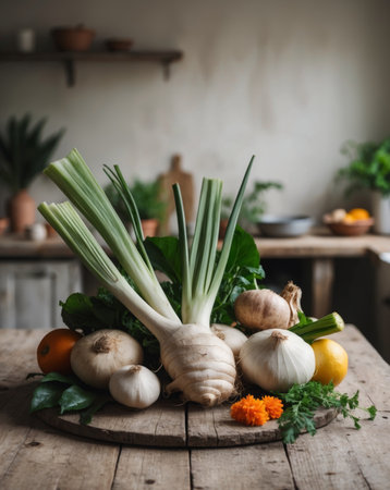 AI Generated. Fresh Galangal Root with Organic Vegetables in a Rustic Kitchen Setting