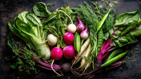 A stunning display of fresh organic vegetables, including radishes, lettuce, cucumbers, and chard, styled beautifully on a dark background, perfect for culinary creativity and healthy cooking.