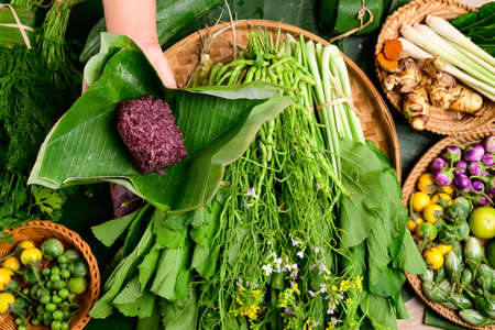 Hand holding purple sticky rice wrapped by banana leaf and fresh organic Asian vegetables from local farmer market, Northern Thailand