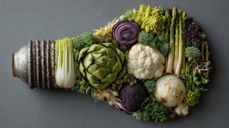 This unique arrangement features an artistic display of various fresh vegetables shaped like a lightbulb, set against a gray background, perfect for promoting healthy eating and creativity in cuisine.
