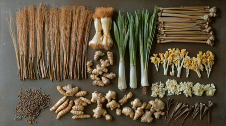 A stunning display of fresh herbs and vegetables, showcasing ginger, leeks, cauliflower, and spices. Perfect for culinary inspiration and healthy cooking.