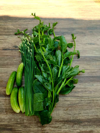 Different fresh vegetables on the table before cookingconcept: harvest and healthy organic food from the farm, diet nutrition antioxidant assorted vitamin in the garden, Variety of green plants